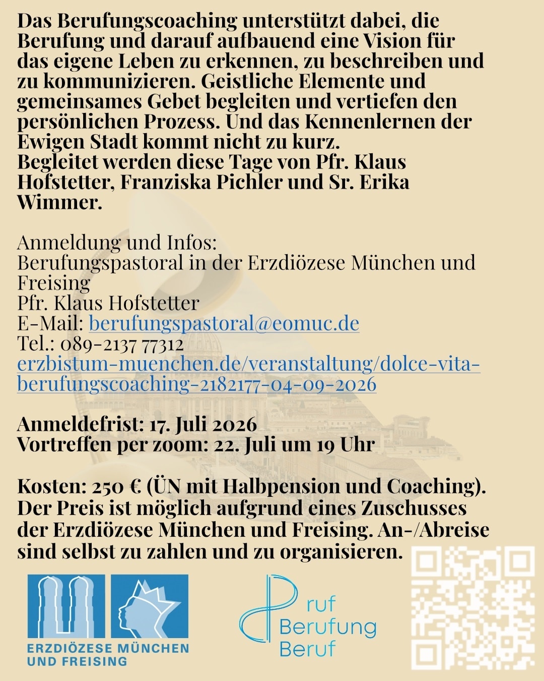 Bei Interesse melde dich bei Pfr. Klaus Hofstetter (Telefon: 089 2137-77312, Email: berufungscoaching(at)eomuc.de) oder informiere dich auf der Homepage.