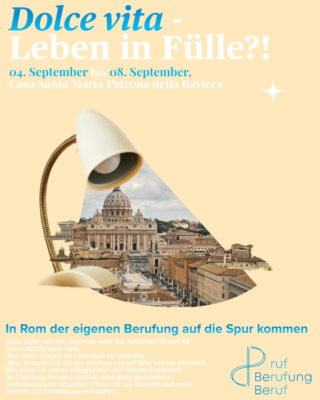 In Rom der eigenen Berufung auf die Spur kommen. Dazu laden die Kolleginnen und Kollegen der Berufspastoral alle ein, die zwischen 18 und 40 Jahre alt sind und sich fragen: „Was brauche ich für ein erfülltes Leben? Was will ich wirklich? Wie kann ich meine Fähigkeiten und Talente entfalten?“ Im Coaching-Prozess wird eine realistische und attraktive Vision für die eigene Zukunft und erste Umsetzungsschritte erarbeitet.